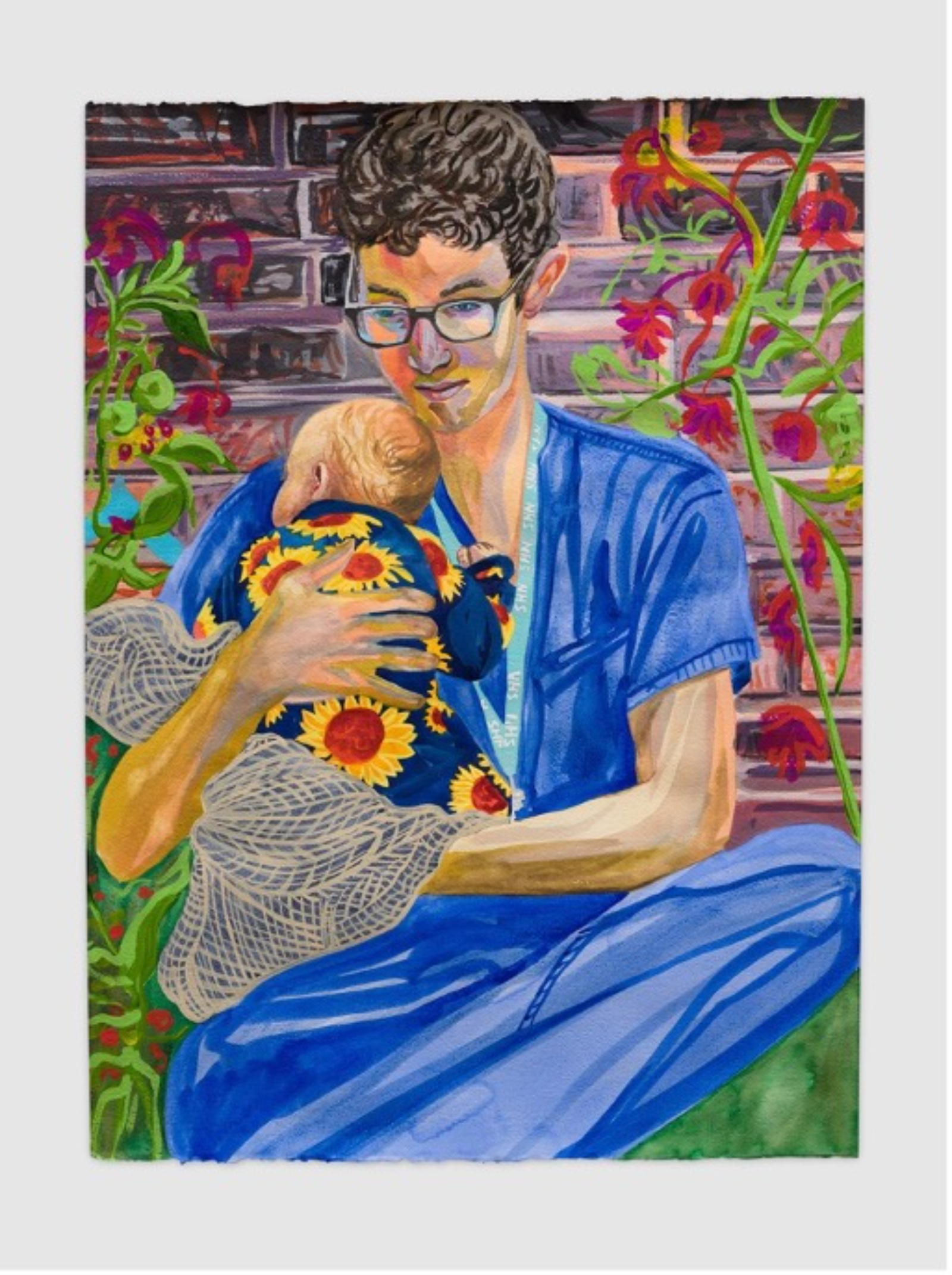 All of these portraits are made from long virtual conversations with the selected NHS staff, conducted over video calls from her studio in New York, in order to acquaint with them personally. They are visual archives of altruism under pressure, particularly through portraits like that of Jessica, a student nurse from a family of caregivers who returned to the frontline, or Ryan, a respiratory doctor who became a new father during the first wave. By doing so, the series situates these individuals in both public and private spheres, portraying them not only as healthcare providers but also as people navigating personal joys and uncertainties during the COVID-19 pandemic. She combines close observational detail with luminous, vibrant color palettes that animate each canvas, giving her sitters a vivid, almost palpable presence. The sense of life created by the saturated colors creates a sense of life and dynamism that contrasts with the pandemic’s grim. Rather than idealizing her subjects, Nisenbaum paints with care and specificity, with oil painting and watercolor techniques that soften and smooth the surface while preserving the intricacies of facial expression, posture, and gesture.