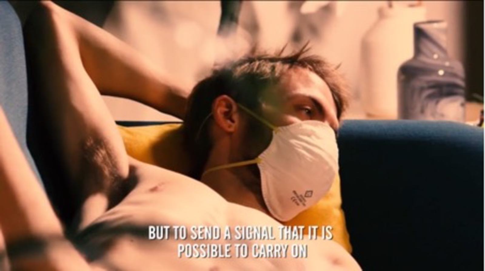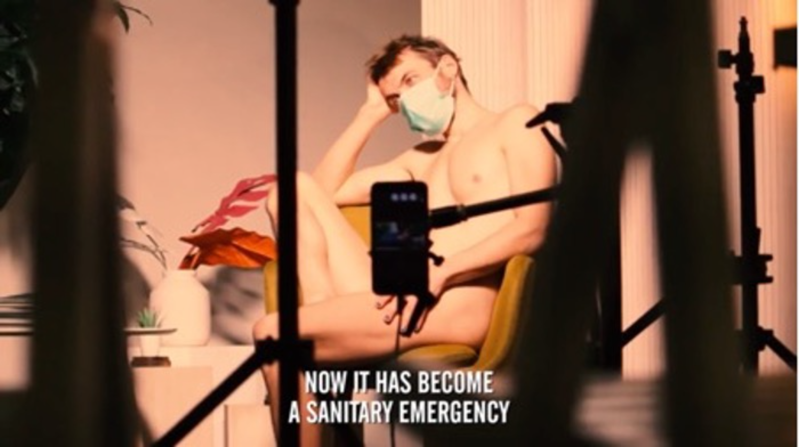 Image 3. A male nude posing for drawing, with a surgical mask on. Image via https://www.open.online/2020/03/17/covid-uncovered-an-artistic-project-and-a-charity-auction-to-exorcise-coronavirus/.