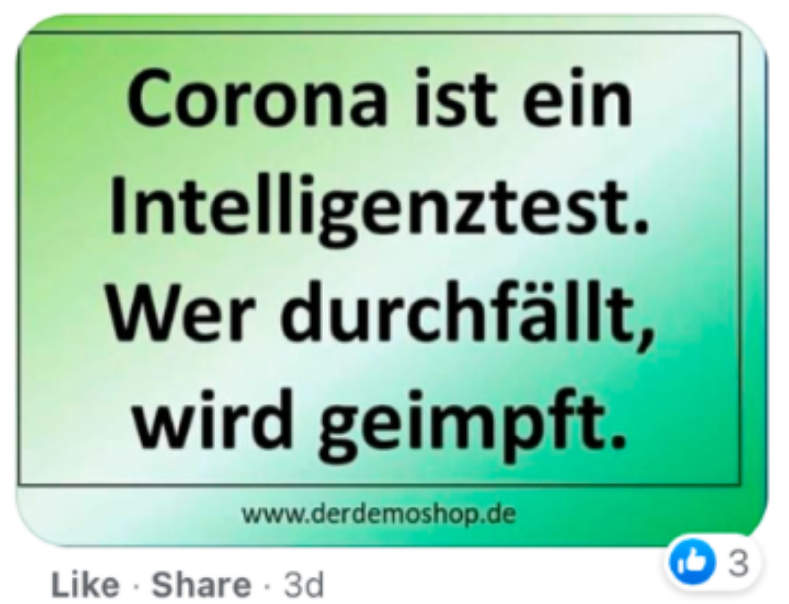 Figure 3. ‘Corona is a test of intelligence. Those who fail, receive the vaccine.’ Via “Extremist Language in Anti-COVID-19 Conspiracy Discourse on Facebook” by Karoline Marko. Critical Discourse Studies, vol. 21, no. 1, 9 Aug. 2022, pp. 92–111. https://doi-org.ezproxy.lib.torontomu.ca/10.1080/17405904.2022.2110134.