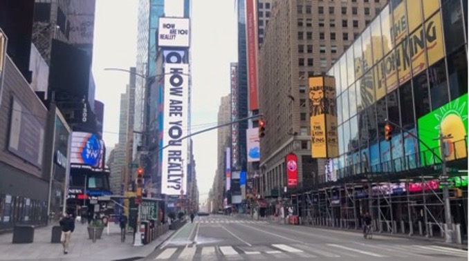 Image 1. The empty street of New York. Screenshot of film still. Julia Solomonoff, hand, writing. 2021. Video, color, sound, 14 min., 38 sec. The Shed, New York.Image 2. A person jogging next to the New York cityscape, with a signage saying the COVID public health precaution in the forefront. Screenshot of film still. Julia Solomonoff, hand, writing. 2021. Video, color, sound, 14 min., 38 sec. The Shed, New York.