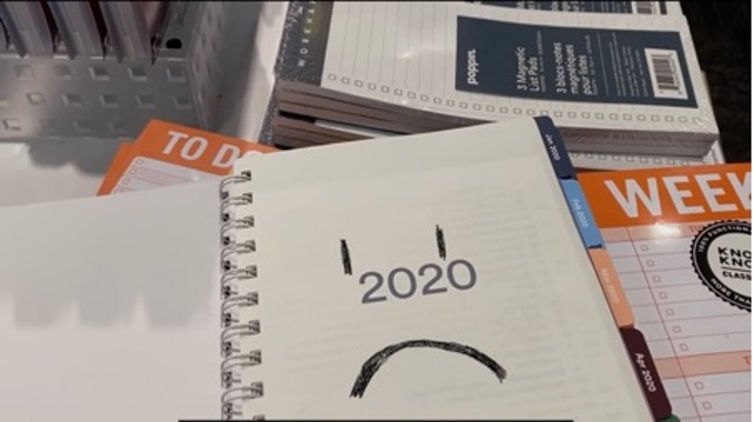 Image 3. A 2020 schedule book doodled with an unhappy face. Screenshot of film still. Julia Solomonoff, hand, writing. 2021. Video, color, sound, 14 min., 38 sec. The Shed, New York.