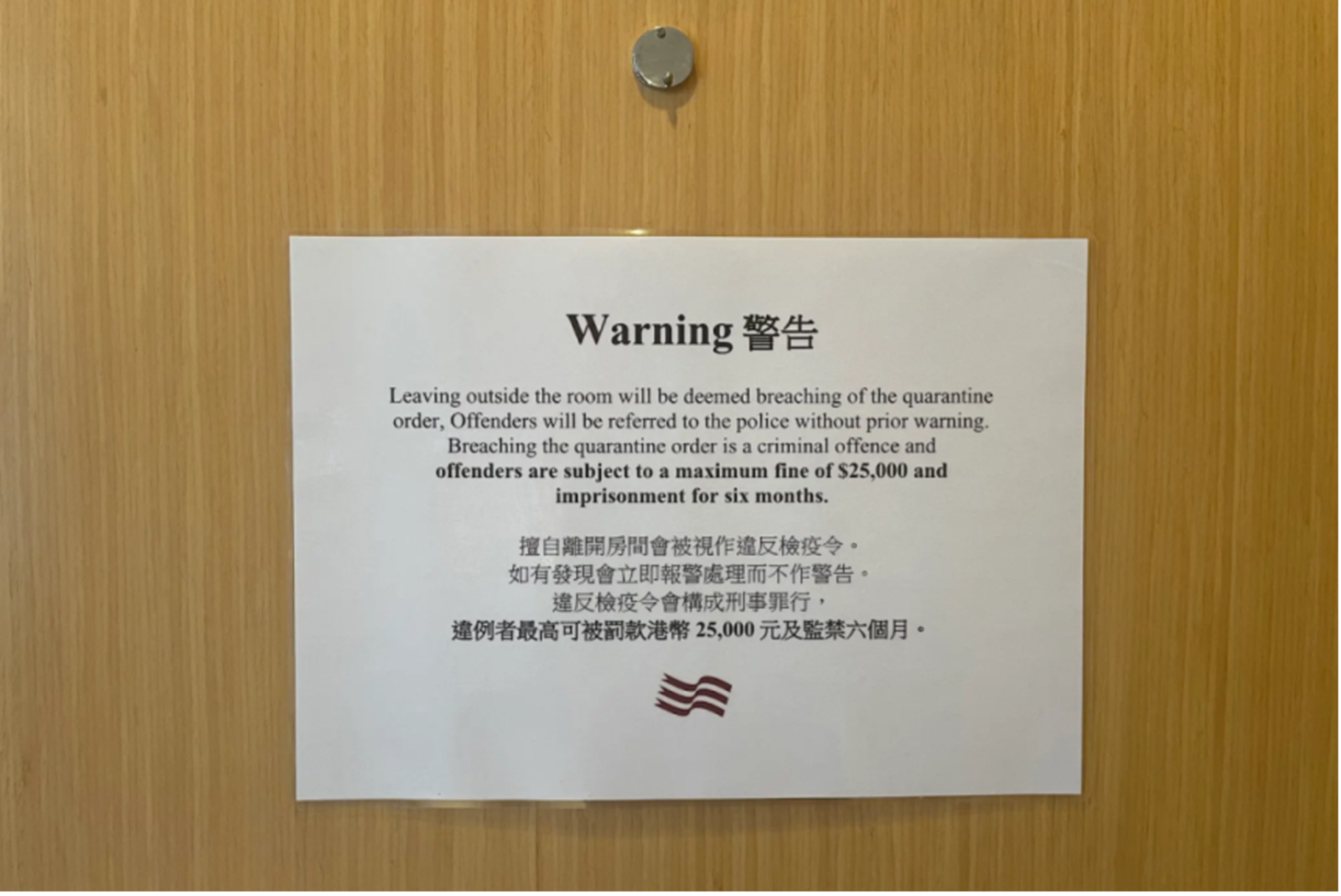A sign posted on the hotel room door warns guests not to leave the room. Caroline Chen, via “I Saw Firsthand What It Takes to Keep Covid out of Hong Kong. It Felt like a Different Planet.” ProPublica, 6 Jan. 2022.Citation: Chen, Caroline. “I Saw Firsthand What It Takes to Keep Covid out of Hong Kong. It Felt like a Different Planet.” ProPublica, 6 Jan. 2022, bit.ly/42gxlwK. NON-FICTION, PERSONAL ACCOUNT, DEC 2021 – JAN 2022 | CHINA. ll