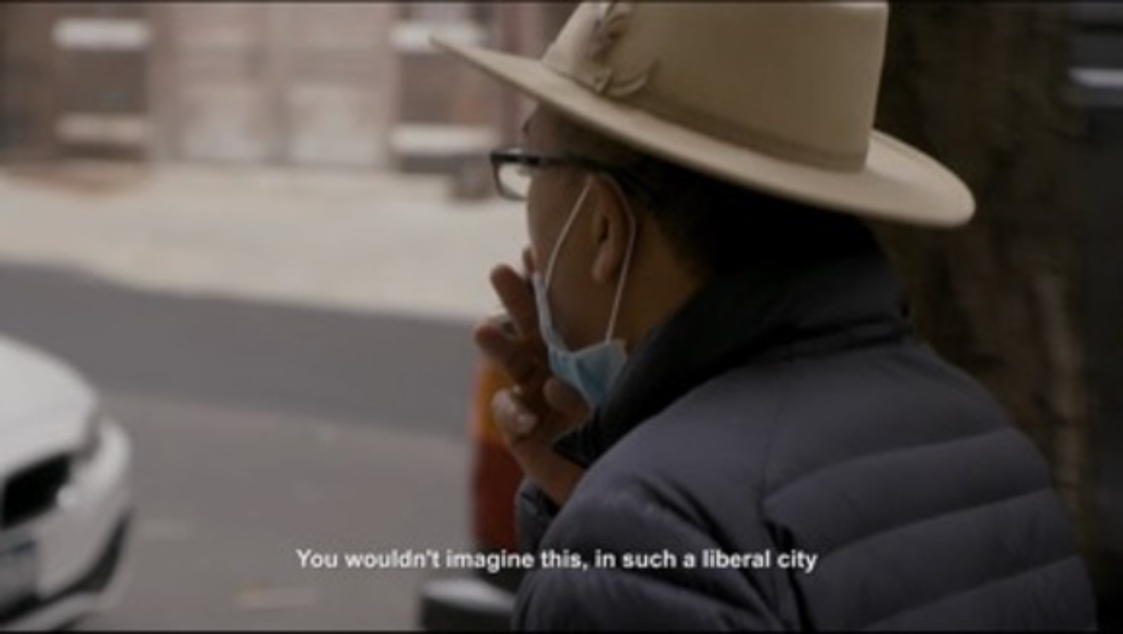 Image 4. In this accompanying film, Spring in New York, Liu Xiaodong discusses this recent body of work, while walking the streets of New York City. Produced by Meerkat Media © 2020. Screenshot of film still. Video via https://www.lissongallery.com/studio/liu-xiaodong-in-new-york-june-2020-2.
