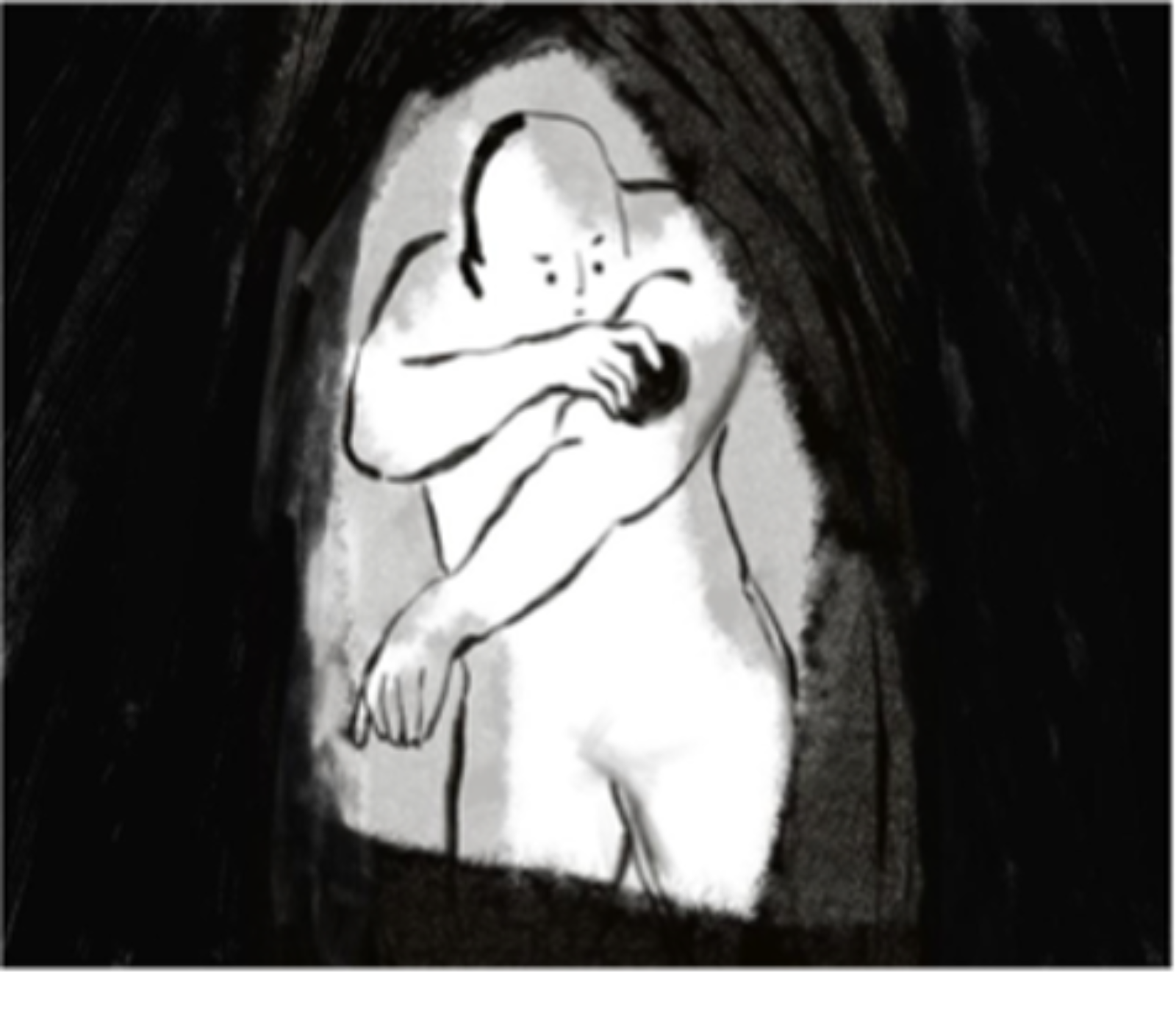 The picture shows a nude, burly figure staring at a dark blob on their arm with their brows furrowed, as they keep their hand on the blob. The dark blob is in stark contrast to the white and light gray skin tone of the figure, recalling the juxtaposition between dirt and cleanliness. Although the blob is featureless and open to interpretation, it could be understood as a washcloth stained with dirt after wiping the body, so parts of the figure are colourless, or in this interpretation, cleaned by the washcloth. The blob could also be a chunk of dirt that the figure is trying to remove. Both interpretations illustrate cleaning and removing dirt from one’s body, a widespread experience during the pandemic as personal hygiene was emphasized to defend from COVID-19. The figure’s furrowed brows could imply attentiveness or anxiety regarding the dark blob. One interpretation is that the figure is focused on washing themselves; another is their anxiety about the dirt on their body, both of which highlight the increased importance of cleanliness and anxiety about COVID-19 contamination during the pandemic. Another feature of the picture that highlights the anxiety around dirt is the dark background which seems to be encroaching on the figure, illustrating the impression of COVID-19’s ubiquity. The narrow space that the dark background leaves for the figure evokes a sense of claustrophobia, representing the difficulty of isolating in a small, shared living environment and the absence of privacy and personal space.
